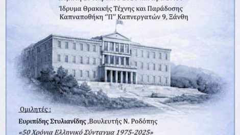 Με αφορμή τη συμπλήρωση μισού αιώνα από την καθιέρωση του Συντάγματος της Γ’ Ελληνικής Δημοκρατίας, ο Βουλευτής Ροδόπης της Νέας Δημοκρατίας, τ...