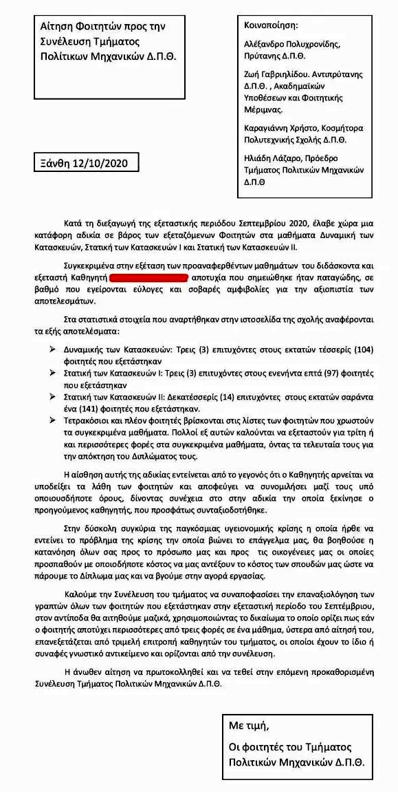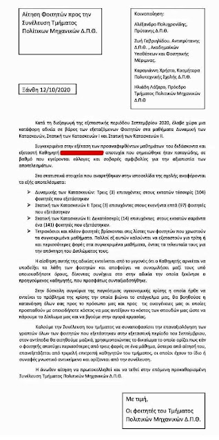 Αναλυτικά η επιστολή των φοιτητών του τμήματος Πολ. Μηχανικών: