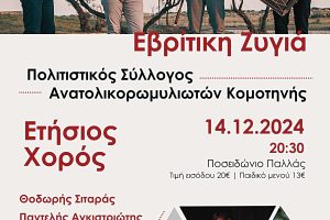 Το Σάββατο 14 Δεκεμβρίου 2024 θα πραγματοποιηθεί ο Ετήσιος Χορός του Συλλόγου Ανατολικορωμυλιωτών Κομοτηνής στο POSEIDONIO PALLAS στις 20.30 η ώρα. Το μουσικό...