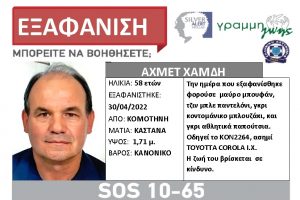 Ο Αχμέτ Χαμδή, 58 ετών, εξαφανίστηκε από το σπίτι του, στην Κομοτηνή, την 30/04/22. Έχει καστανά μάτια, ύψος 171μ και είναι κανονικού βάρους. Την ημέρα που...