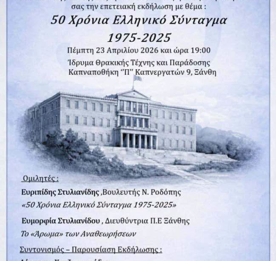 Με αφορμή τη συμπλήρωση μισού αιώνα από την καθιέρωση του Συντάγματος της Γ’ Ελληνικής Δημοκρατίας, ο Βουλευτής Ροδόπης της Νέας Δημοκρατίας, τ...