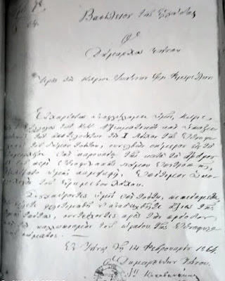 Ευχαριστήρια επιστολή του Δήμου Τήνου προς τον Ιωάννη Φιμερέλη (14/2/1864) |