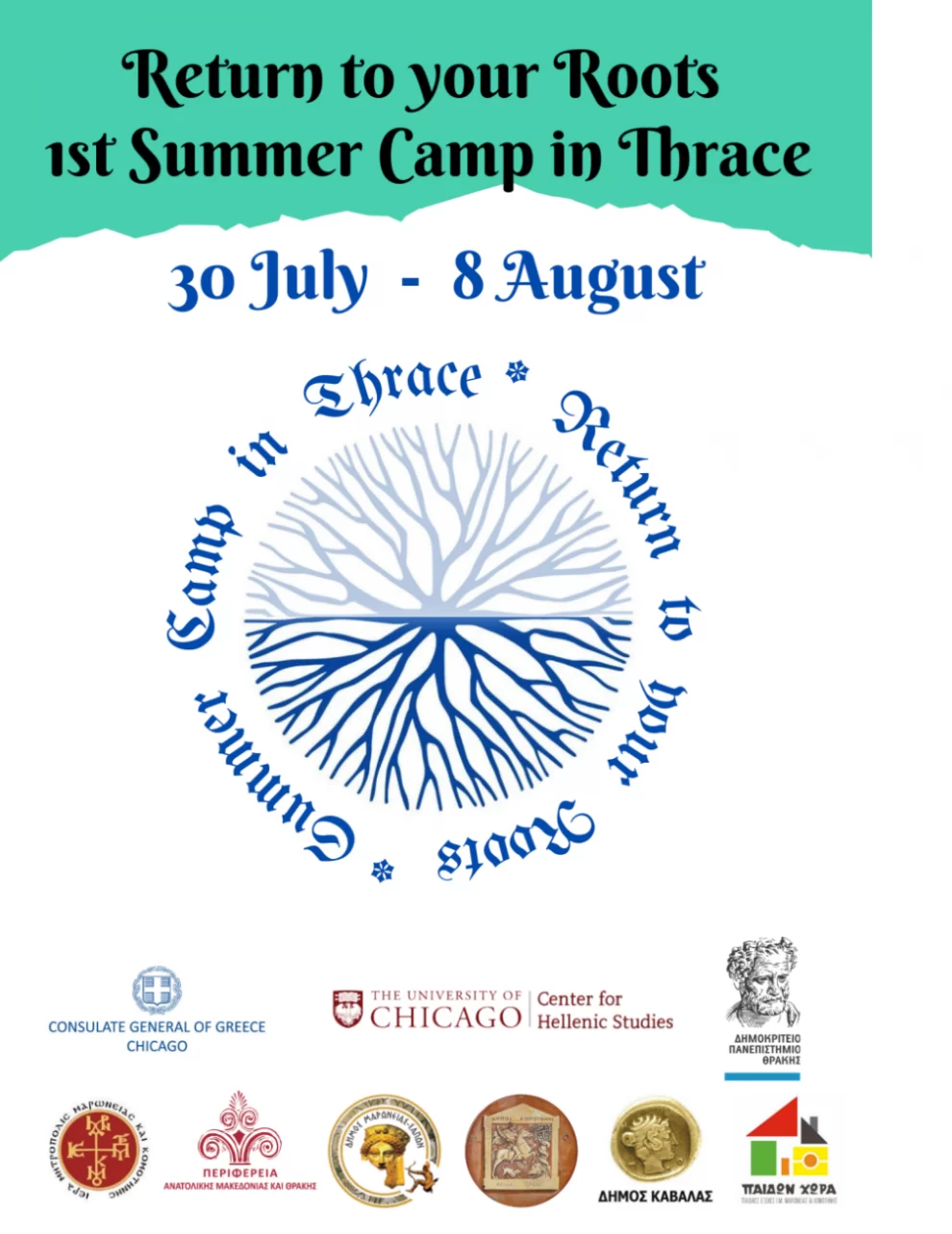 Το 1ο Θερινό Summer Camp Return to your Roots, πραγματοποιείται στη Θράκη σε συνεργασία του Δημοκριτείου Πανεπιστημίου Θράκης και του Εργαστηρίου +Μόρφωση του Δ.Π.Θ. με το Κέντρο Ελληνικών Σπουδών του Πανεπιστημίου του Σικάγο με τη στήριξη του Γενικού Προξενείου της Ελλάδος στο Σικάγο και υλοποιείται υπό την αιγίδα της Περιφέρειας Αν. Μακεδονίας και Θράκης, και της Μητροπόλης Μαρωνείας και Κομοτηνής. Το θερινό Summer Camp Return to your Roots στηρίζεται από τον Δήμο Καβάλας, τον Δήμο Κομοτηνής και τον Δήμο Μαρωνείας- Σαπών.