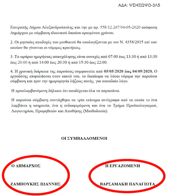 Συγκεκριμένα διόρισε με σύμβαση ορισμένου χρόνου στο Πολυκοινωνικό την αδελφή της και στο Δήμο την κόρη της. Η πρώτη με τη δική της υπογραφή και η δεύτερη με την υπογραφή του κ. Ζαμπούκη.
