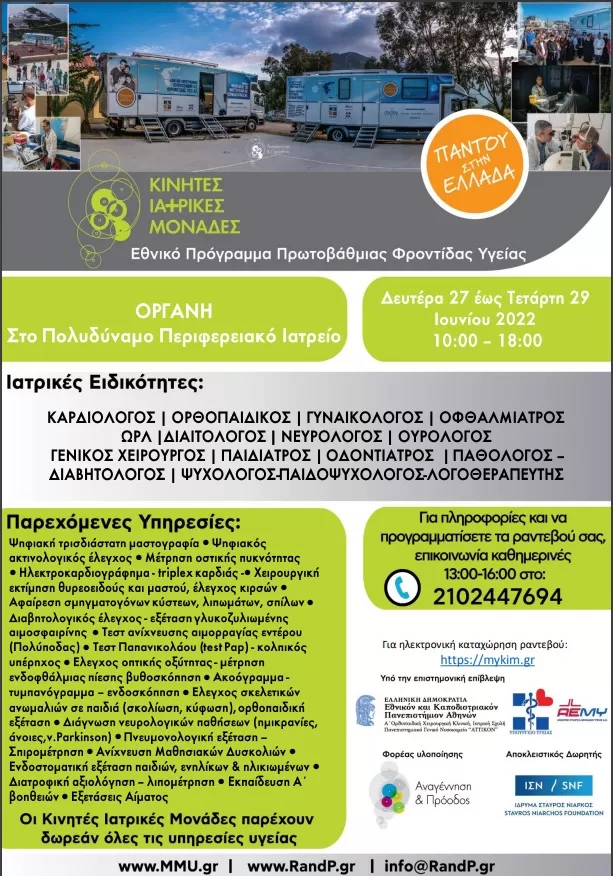 Κλιμάκιο 22 ιατρών και νοσηλευτικού προσωπικού, 13 διαφορετικών ειδικοτήτων θα επισκεφθεί με κινητές ιατρικές μονάδες την περιοχή στο πλαίσιο του Εθνικού Προγράμματος Πρωτοβάθμιας Φροντίδας Υγείας.