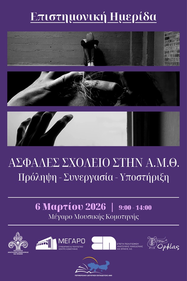 Η Περιφερειακή Διεύθυνση Εκπαίδευσης Ανατολικής Μακεδονίας και Θράκης διοργανώνει την Παρασκευή 6 Μαρτίου 2026, από τις 09:00 έως τις 14:00, ημερίδα με τίτλο «Ασφαλές Σχολείο στην ΑΜΘ: Πρόληψη – Συνεργασία – Υποστήριξη», στο Μέγαρο Μουσικής Κομοτηνής.