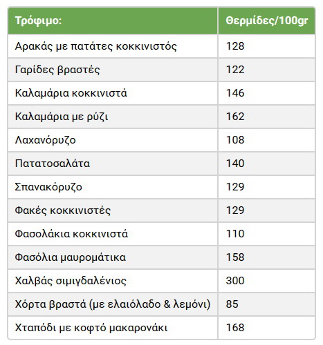 Μπορείτε να δείτε το θερμιδικό περιεχόμενο των πιο συνηθισμένων νηστίσιμων τροφίμων στον πίνακα που ακολουθεί: