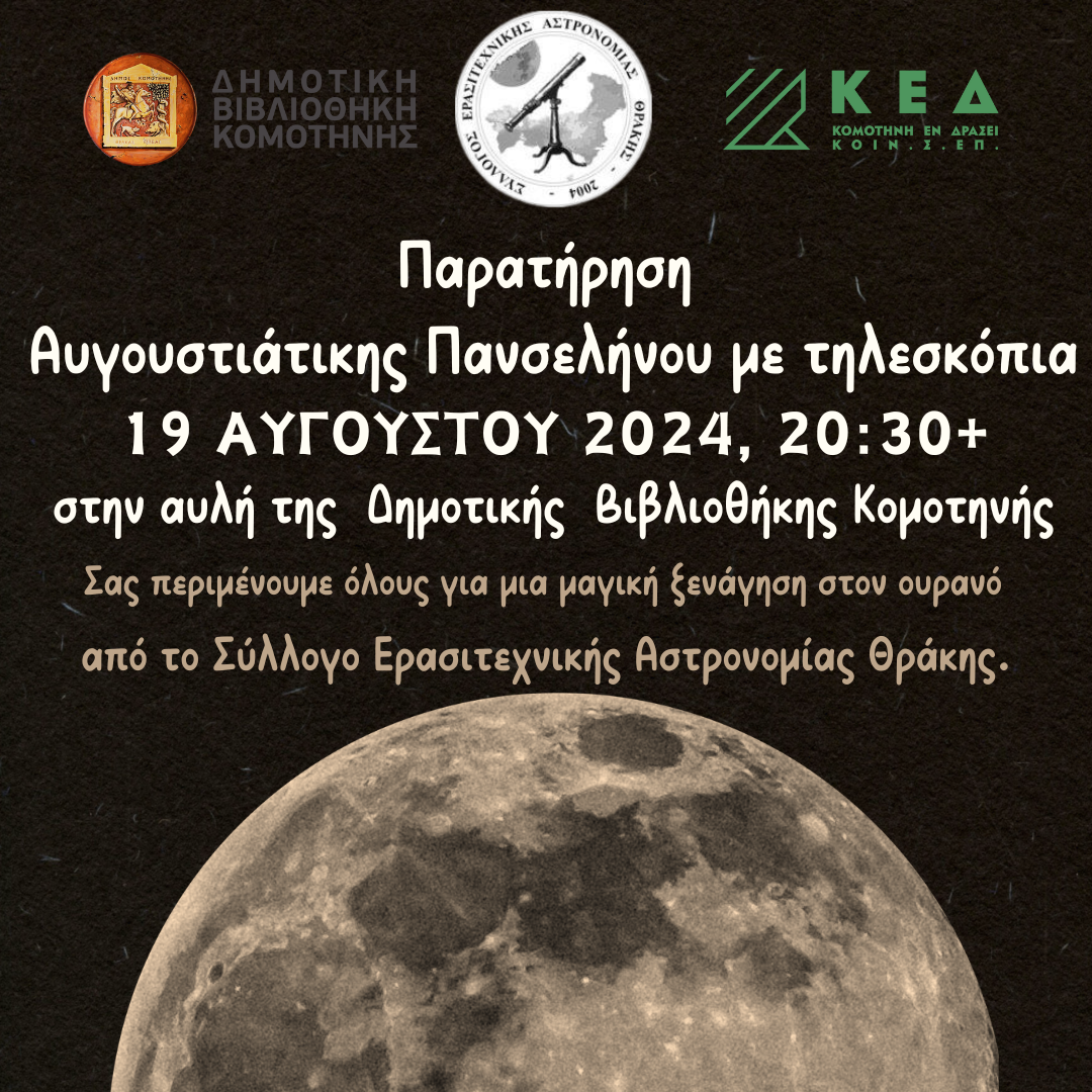 H Δημοτική Βιβλιοθήκη Κομοτηνής στο πλαίσιο των δράσεων που υλοποιούνται με την ΚΟΙΝΣΕΠ «Κομοτηνή Εν Δράσει» και ο Σύλλογος Ερασιτεχνικής Αστρονομίας Θράκης διοργανώνουν παρατήρηση της Πανσελήνου του Αυγούστου με τηλεσκόπια, τη Δευτέρα 19 Αυγούστου 2024, 20:30 στην αυλή της Δημοτικής Βιβλιοθήκης Κομοτηνής