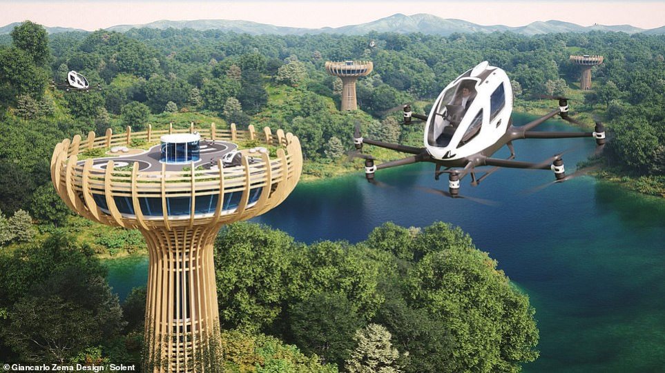 Πώς θα είναι το σκηνικό του μέλλοντος; Τα «μεγάλα μυαλά» σχεδιάζουν ήδη τη νέα πραγματικότητα, η οποία -βέβαια- θα στηρίζεται στην τεχνολογία και στους αυτοματισμούς. Μεγάλη φιλοδοξία, ωστόσο, της ανθρωπότητας, είναι να συνδυαστεί η τεχνολογία με το περιβάλλον. Στο σκεπτικό αυτό βασίζεται το σχέδιο του αρχιτεκτονικού γραφείου Giancarlo Zema Design Group, το οποίο βρίσκεται στη Ρώμη και της κινεζικής εταιρείας EHang Holdings, η οποία διαθέτει την πατέντα για τα ιπτάμενα ταξί.