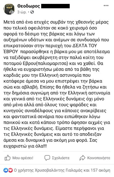 Δείτε το ευχαριστήριο του ιδιοκτήτη της βάρκας προς τις Ελληνικές Αρχές, όπως το κοινοποίησε στο facebook, και ο οποίος κάνει λόγο για ανακρίβειες και φανταστικά σενάρια που ειπώθηκαν: