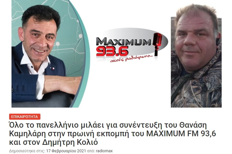 «Όλο το πανελλήνιο μιλάει για την συνέντευξη του Θανάση Καμηλάρη (κάτοικος στο Δέλτα του Έβρου) στην πρωινή εκπομπή του MAXIMUM FM 93.6 και στον Δημήτρη Κολιό, για “τους Τούρκους που μπήκαν στο Αινήσιο Δέλτα και πήραν την βάρκα Έλληνα ψαρά από την Ελληνική πλευρά του ποταμού Έβρου“», περηφανευόταν ο Δημήτρης Κολιός.