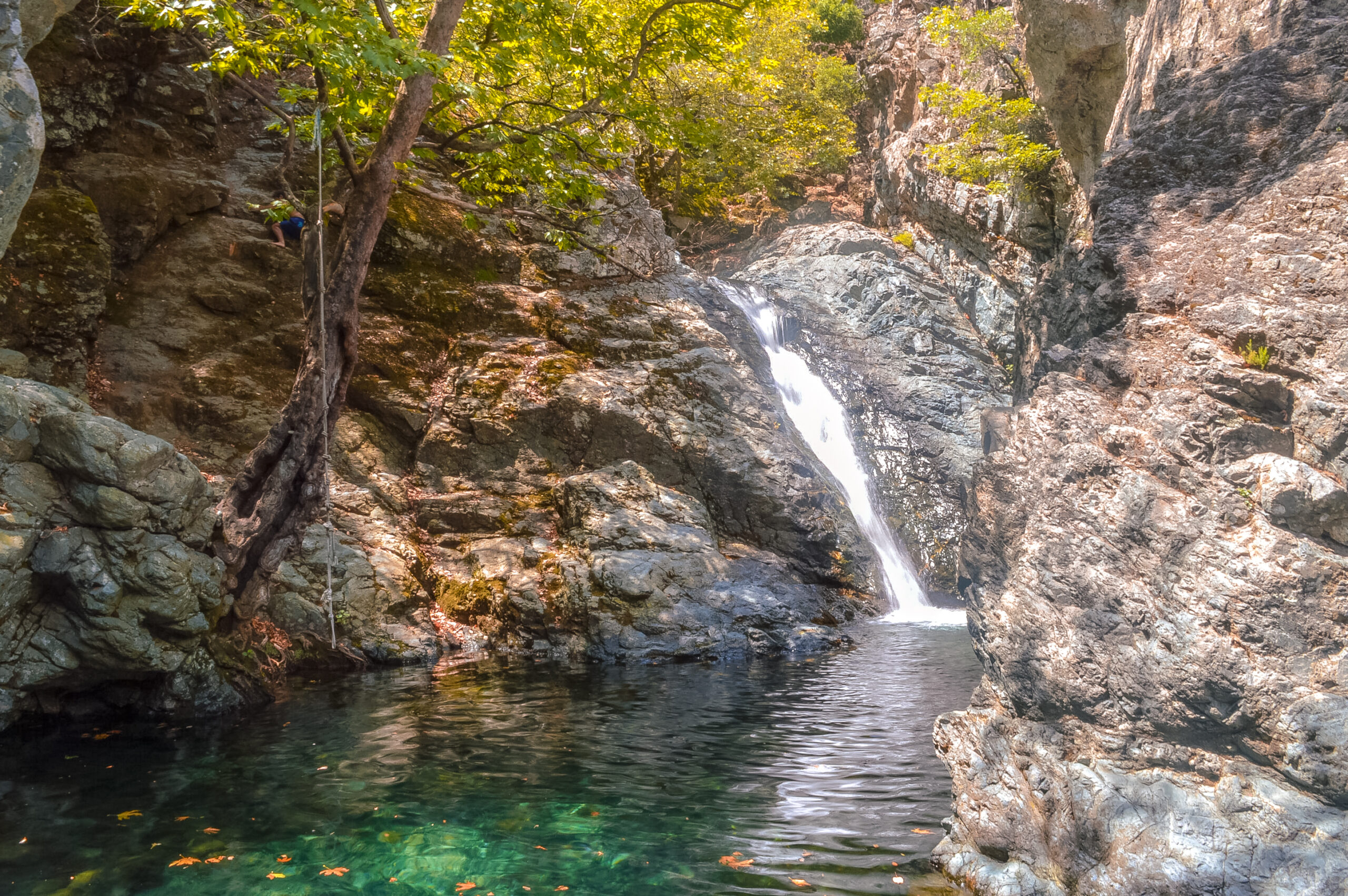 Στο σημείο αυτό θα πρέπει να ανεβείτε έναν κάπως απότομο βράχο, για να βρεθείτε σε μια πολύ όμορφη, μικρή και ρηχή βάθρα με καταρράκτη. Εδώ θα απολαύσετε φυσικό υδρομασάζ, μια εμπειρία που θα τη θυμάστε για καιρό. Στη συνέχεια πρέπει να πατήσετε βήμα βήμα τα βράχια στο πλάι αυτού του πρώτου καταρράκτη και να σκαρφαλώσετε έτσι μέχρι την επόμενη αρκετά μεγάλη και βαθιά βάθρα που βρίσκεται λίγο πιο ψηλά. Εδώ ένα γερό σκοινί κρέμεται από ένα μεγάλο πλατάνι. Αυτό χρησιμοποιούν οι επισκέπτες για να κάνουν τις βουτιές τους, αν και πολλοί πέφτουν κατευθείαν από τα βράχια.