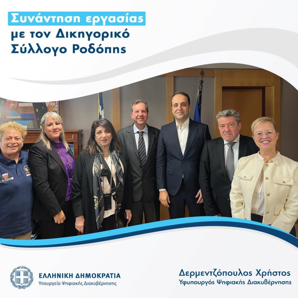 Ο Υφυπουργός Ψηφιακής Διακυβέρνησης Χρήστος Δερμεντζόπουλος υποδέχθηκε στο Υπουργείο εκπροσώπους του Δικηγορικού Συλλόγου Ροδόπης, με επικεφαλής τον Πρόεδρο Δημήτρη Ερελιάδη.