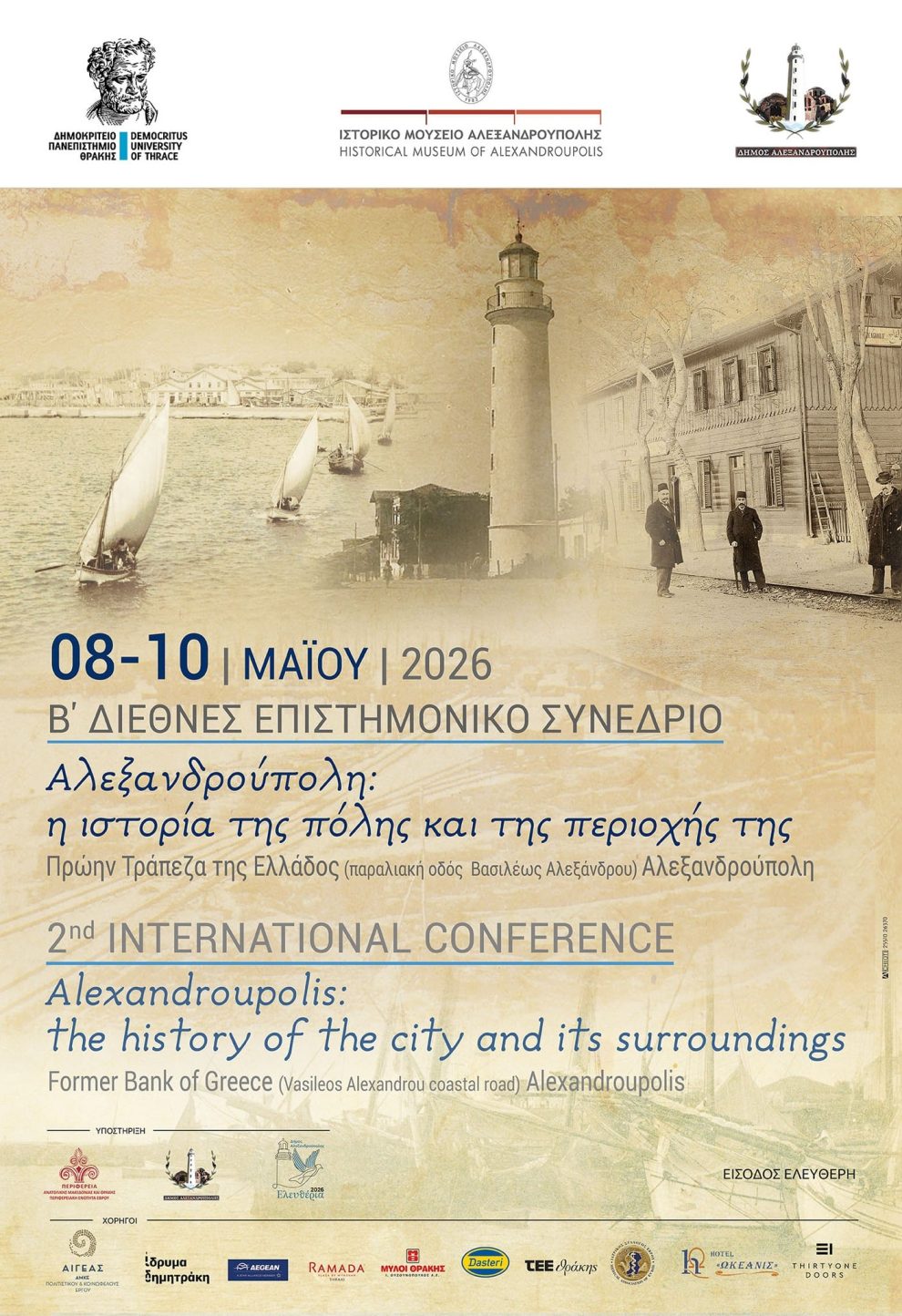 Το Ιστορικό Μουσείο Αλεξανδρούπολης σε συνεργασία με τη Σχολή Ανθρωπιστικών Σπουδών του Δημοκρίτειου Πανεπιστημίου Θράκης και τον Δήμο Αλεξανδρούπολης διοργανώνουν το Β’ Διεθνές Επιστημονικό Συνέδριο με τίτλο «Αλεξανδρούπολη: η ιστορία της πόλης και της περιοχής της». Το συνέδριο θα πραγματοποιηθεί από τις 8 ως τις 10 Μαΐου 2026, στο κτήριο της πρώην Τράπεζας της Ελλάδος, στην Αλεξανδρούπολη.